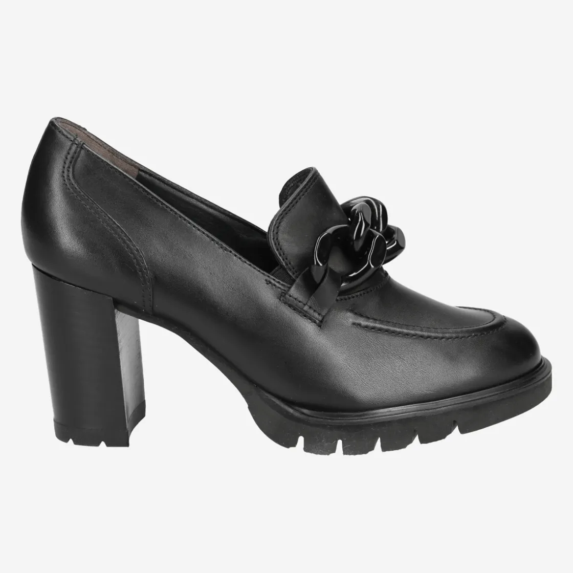 - Block heel, loafer application, decorative stitching, stretch inserts