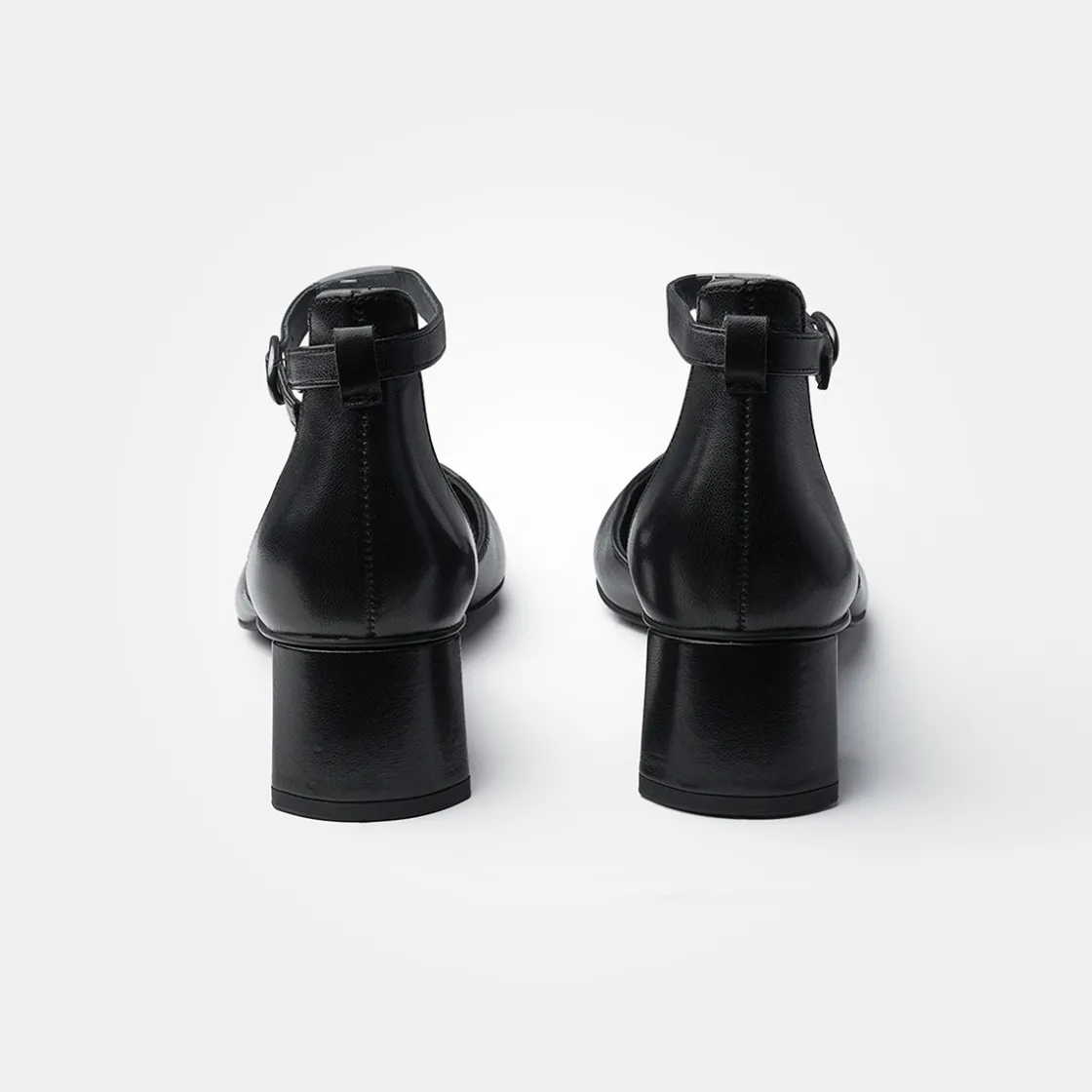 - Press stud with decorative metal fastening, block heel, stretch insert
