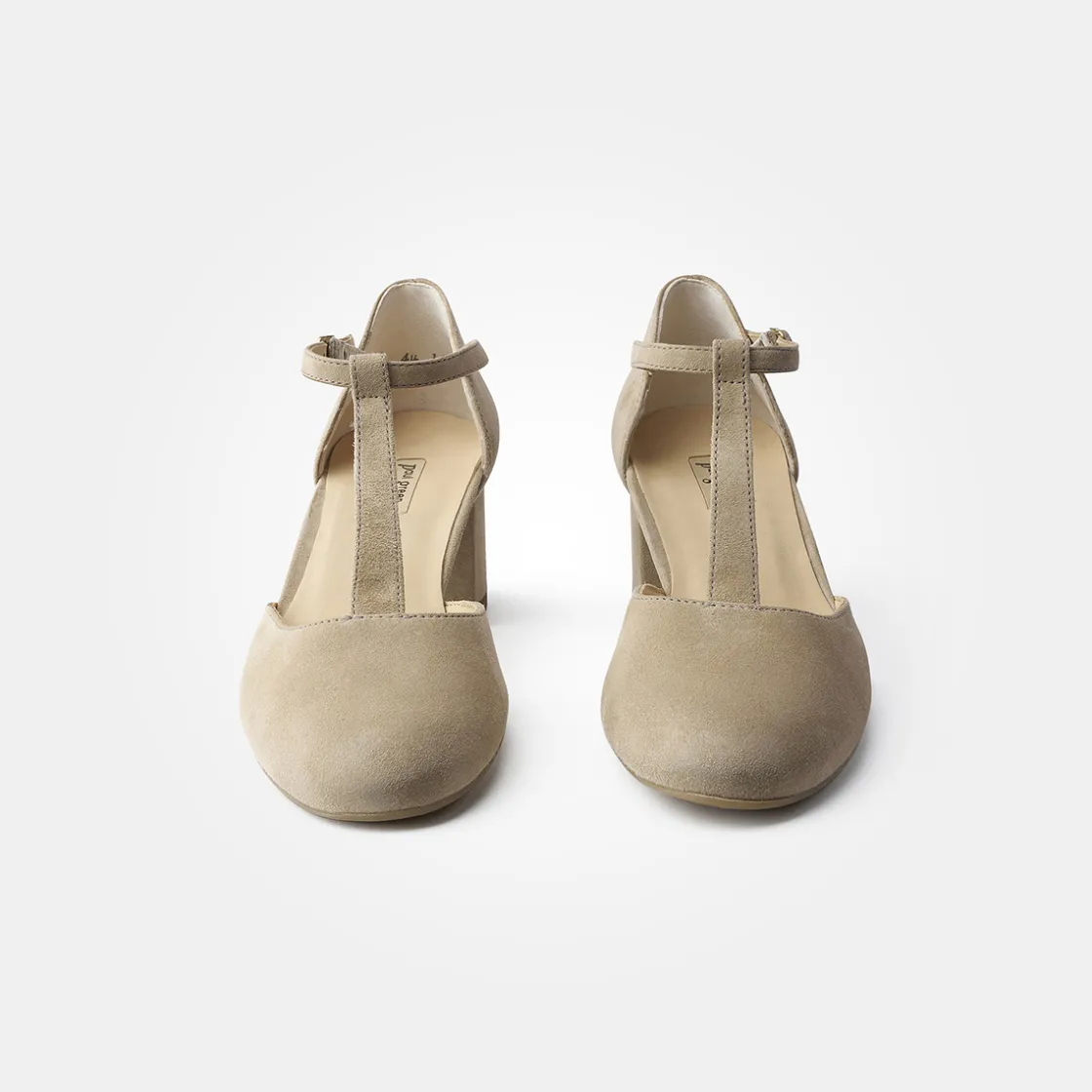 - Stretch insert, block heel, breathable, snap button, T-strip
