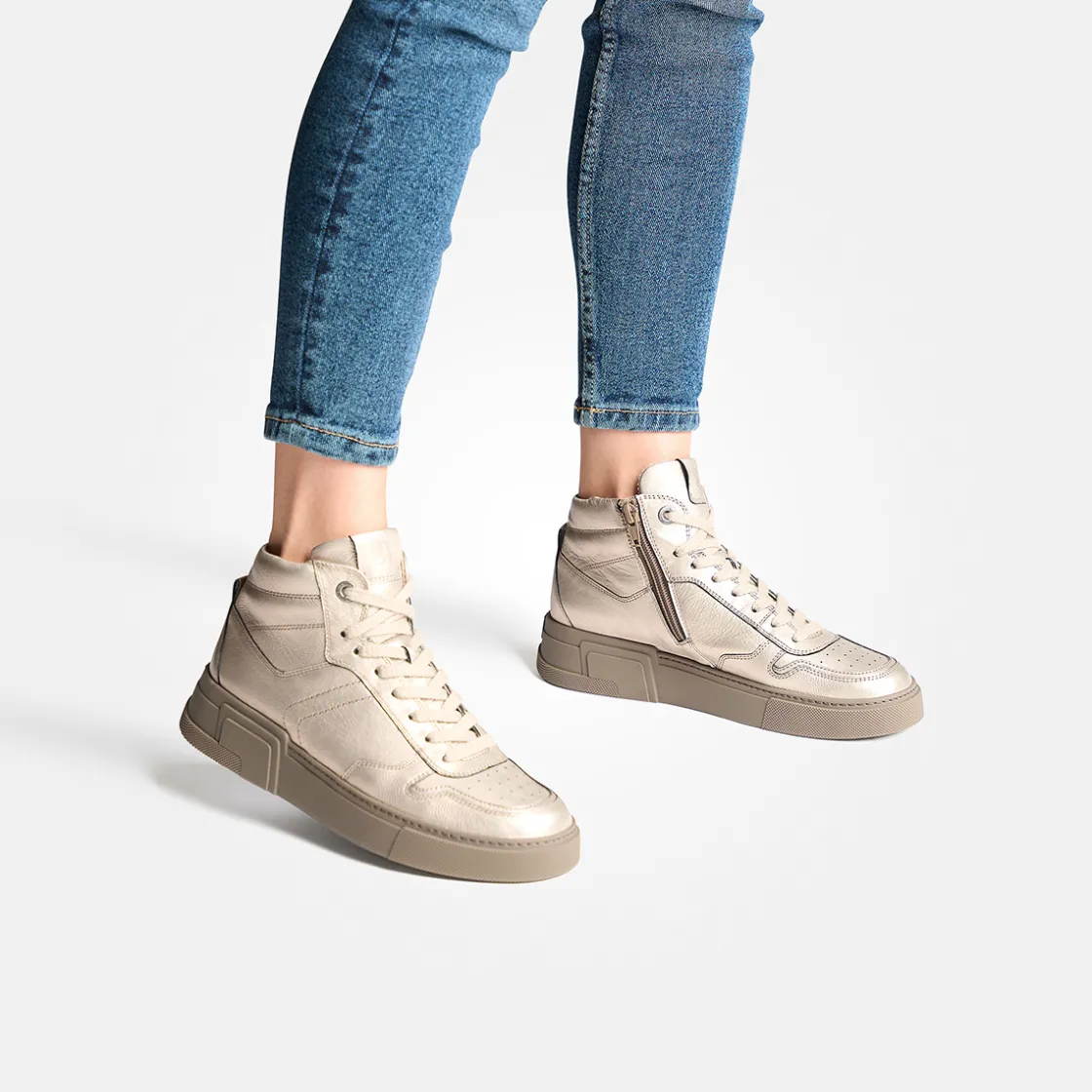 Immerse yourself in the world of urban chic with these trendy high-top trainers with an interchangeable footbed. The high-quality material and precise workmanship lend timeless elegance that adds that certain something to any outfit. With this pair, you can also experience tailor-made comfort by adjusting the insole to your own needs. This allows you to use your own orthopaedic insoles for maximum comfort. The flexible outsole lets you stride through the day with ease. Ready to take your shoe to a new level? Paul Green makes shoes with great passion and mastery, which is expressed in perfection, quality, style and fit. The result: a unique, uplifting wearing experience!