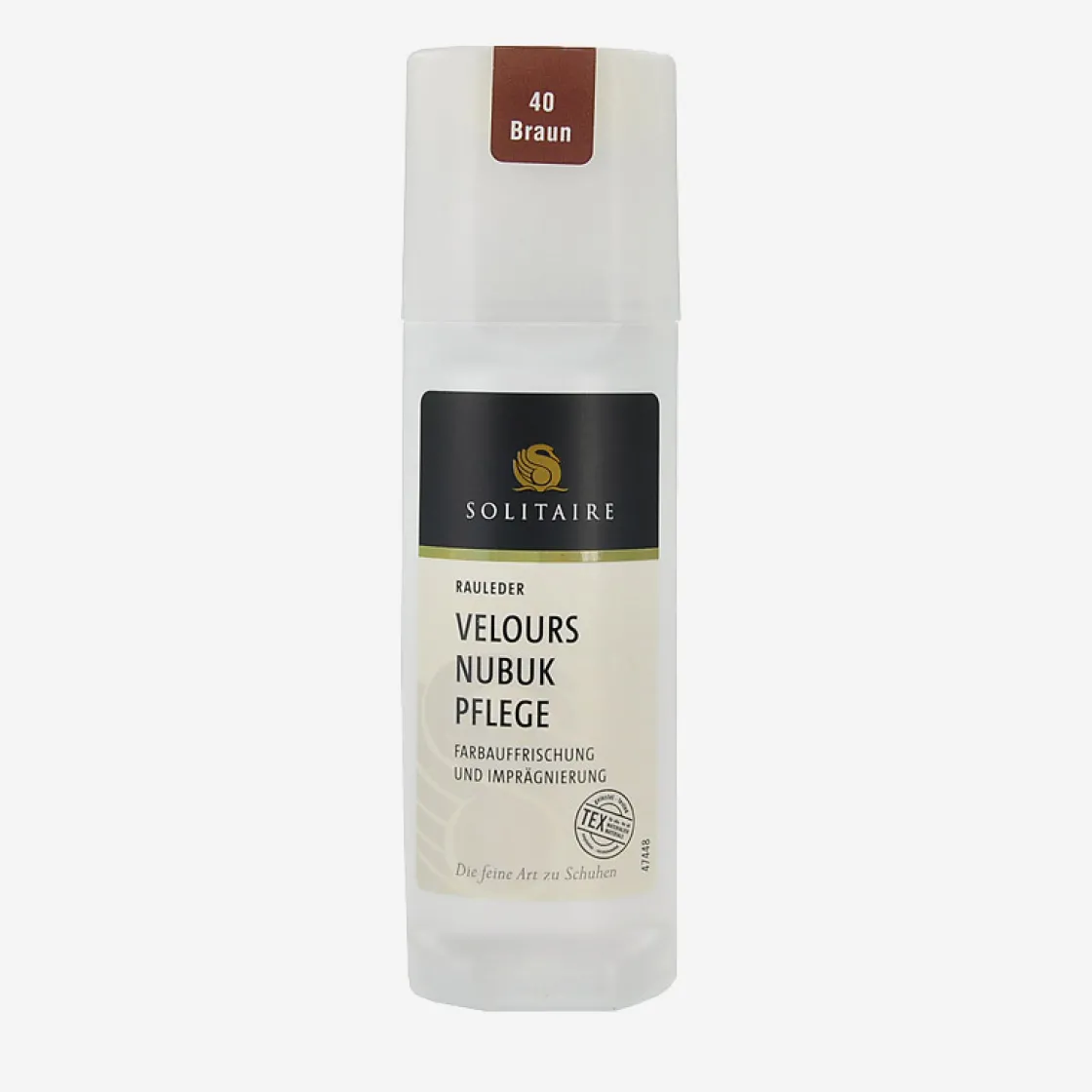 Brown colored suede/nubuck care from Solitaire. Impregnates and has a color activating effect. Ideal care for suede and nubuck leather as well as textiles and tex-materials. Contents: 75 ml. Directions for use: Shake bottle well before use. Dab the liquid onto the shoe. Then allow to dry and then roughen with a suede leather brush.