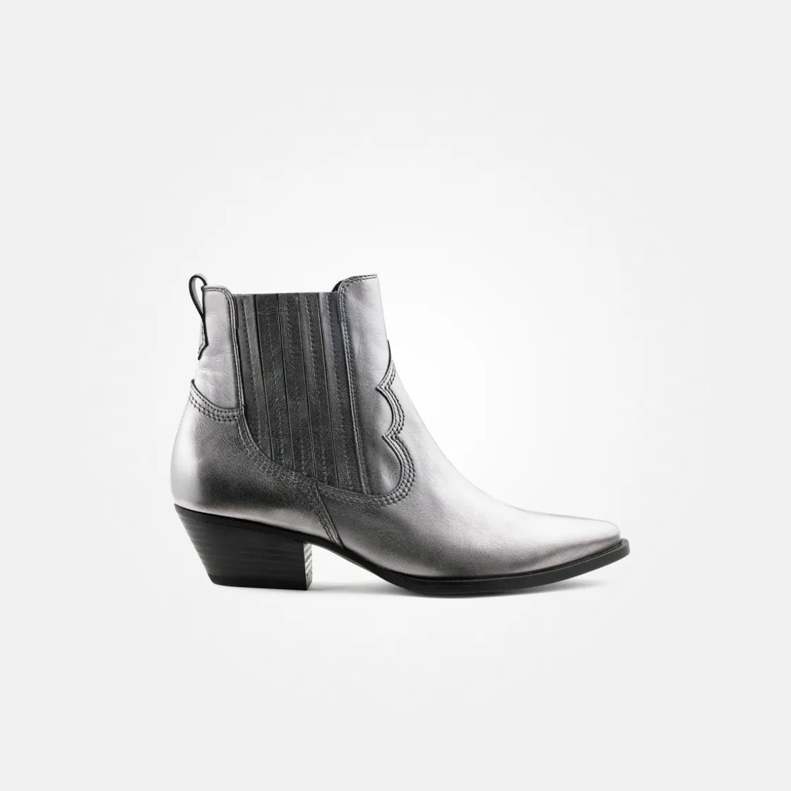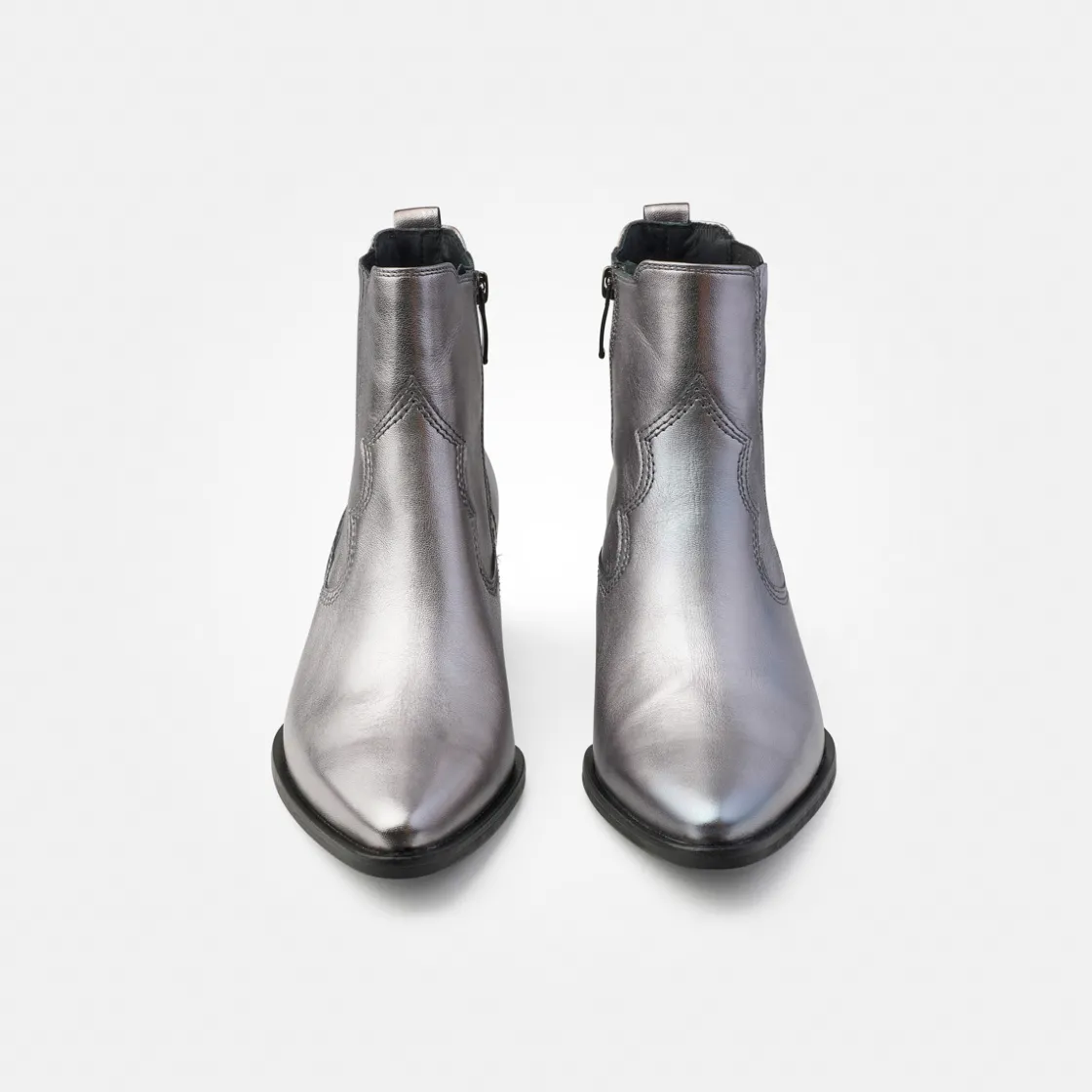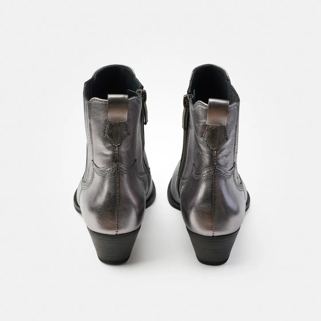 - Metallic-look TREND ankle boot in cowboy/western look, slanted heel, pointed design, Made in Europe PFI Eco-Label LWG – Leather Working Group certified, block heel, SuperSoft, supple leather, soft heel cap, light and flexible outsole, soft footbed