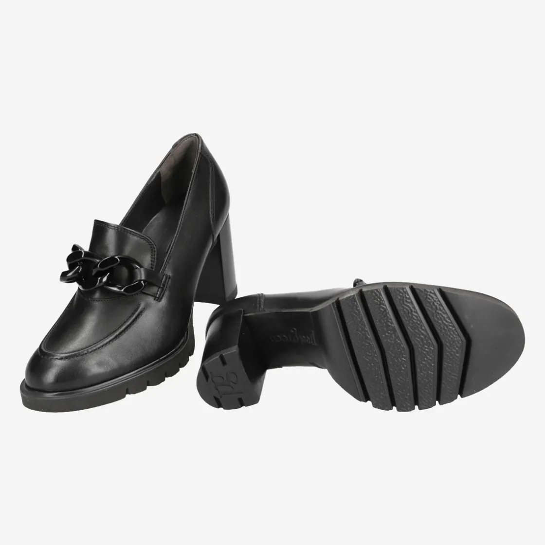 - Block heel, loafer application, decorative stitching, stretch inserts