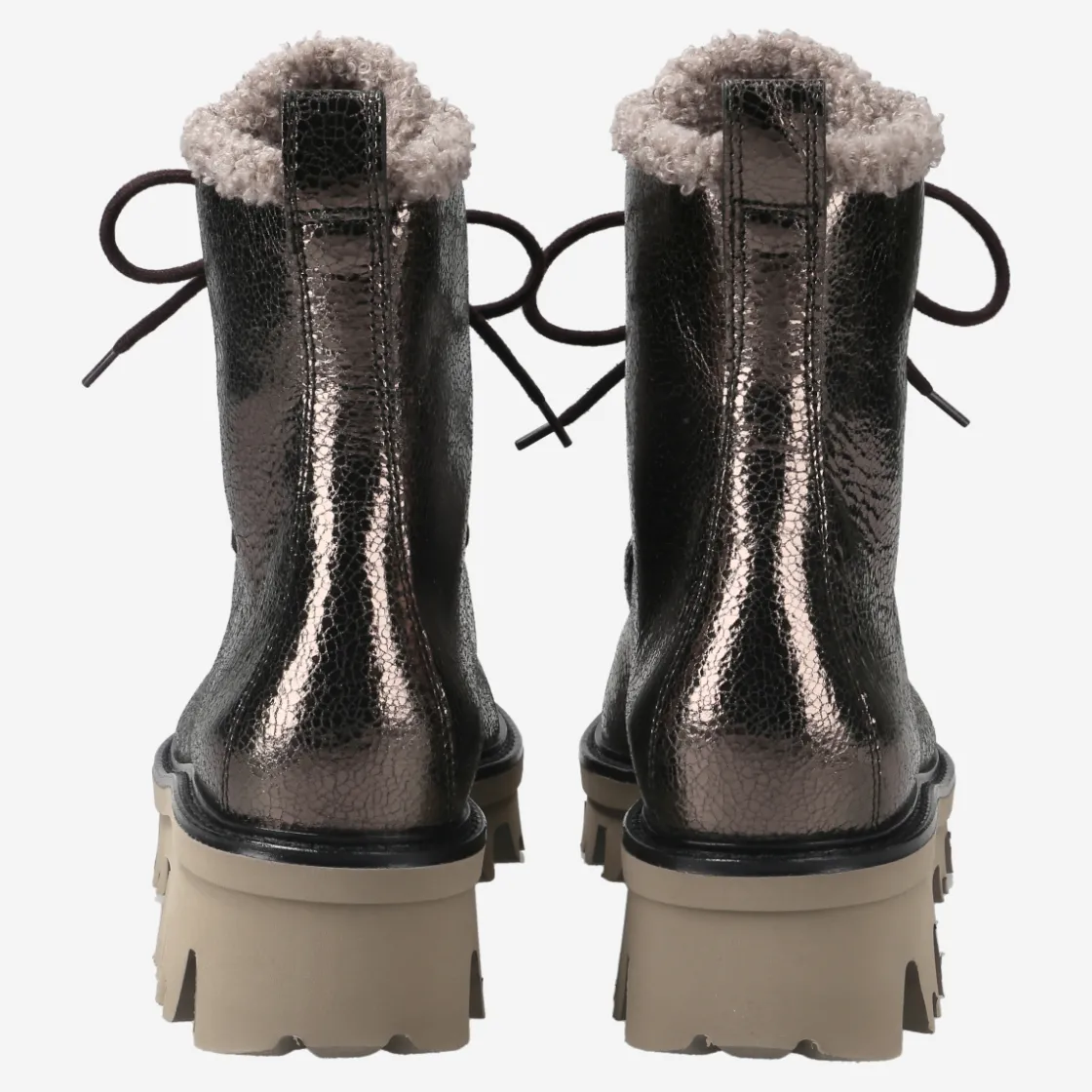 - Block heel, treaded sole, elegant metallic effect in elegantly broken “elephant skin/ desert earth look”, entry loop, embossed logo, decorative stitching, signature bootie for glamorous fall/winter looks