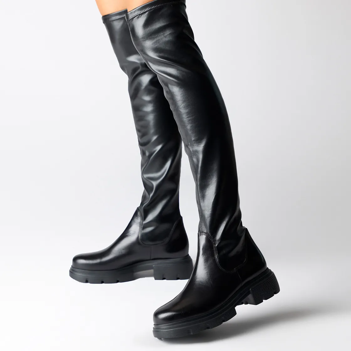 Slim over-the-knee boots by Paul Green are one of the favorite outfits of fashion-conscious women. The elegant smooth leather in black is complemented by highly elastic stretch material in the calf area. Together with the slightly progressive outsole, every step will be a pleasure. This model is made for fashionable, feminine silhouettes! Paul Green makes shoes with great passion and mastery, which is expressed in perfection, quality, style and fit. The result: a unique, uplifting feel! The Paul Green effect.