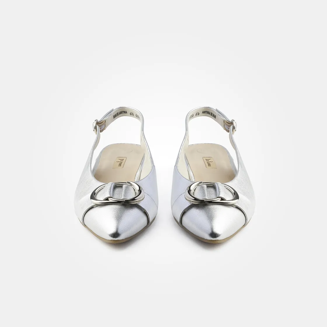- SuperSoft, supple leather, soft heel cap, lightweight and flexible outsole, soft footbed, stretch insert, decorative buckle in the design of a loafer application, sling pump